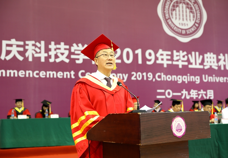 6月26日上午,重庆科技学院2019年毕业典礼暨学位授予仪式在体育馆隆重举行。校领导刘东燕、尹华川、干勤、施金良、吴松、肖大志、刘德绍、贺吉胜、刘上海、朱永利,学校学位评定委员会全体委员、各职能部门和学院(部)负责人、全体毕业研究生导师、全体毕业班级辅导员、2019年全体毕业生及家长代表、在校生代表参加了毕业典礼暨学位授予仪式。毕业典礼由干勤主持。