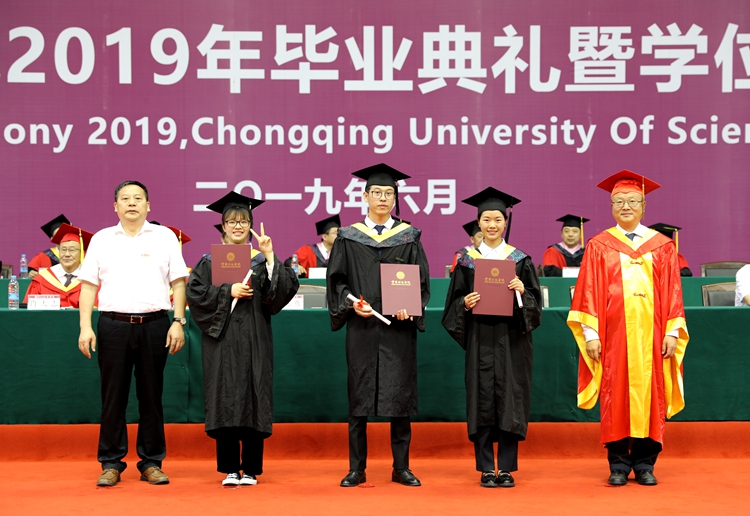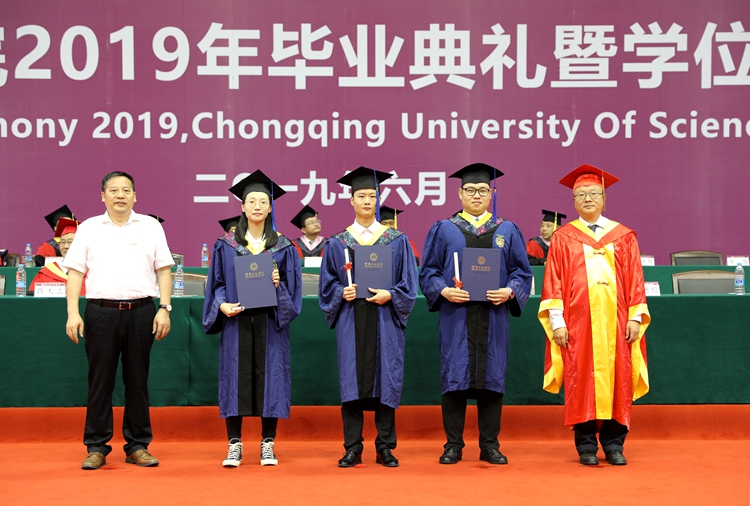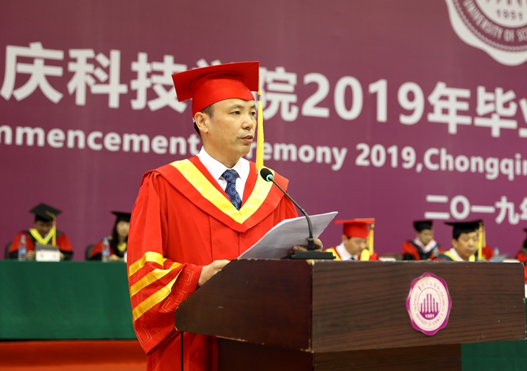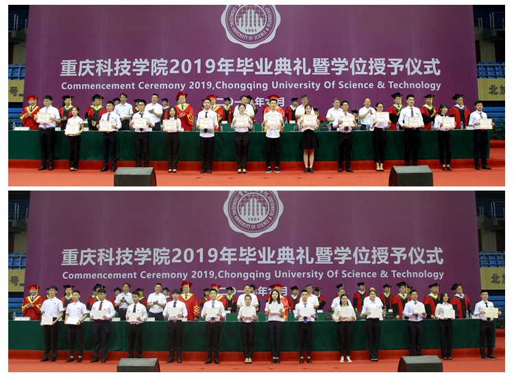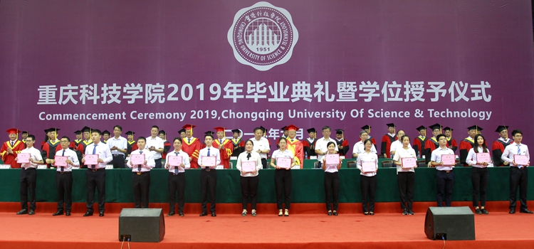 施金良宣读了学校关于准予王萍等108名硕士研究生、赵兴磊等4090名本科毕业生毕业的决定。吴松宣读了重庆市和学校关于表彰2019年优秀毕业生的决定,刘上海宣读了学校聘任校友联络员的决定,与会领导为获奖毕业生代表和校友联络员代表颁发了获奖证书或聘书。