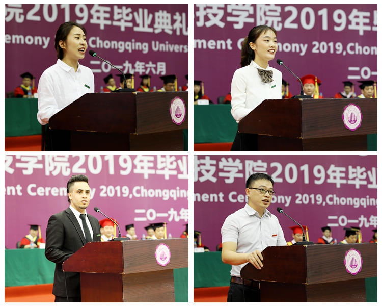 毕业研究生代表、石油与天然气工程学院陈艺为(左上),毕业本科生代表、法政与经贸学院钟玉依(右上),国际毕业生代表卡里姆(左下),教师代表、化学化工学院张鹏(右下)先后在会上发言。