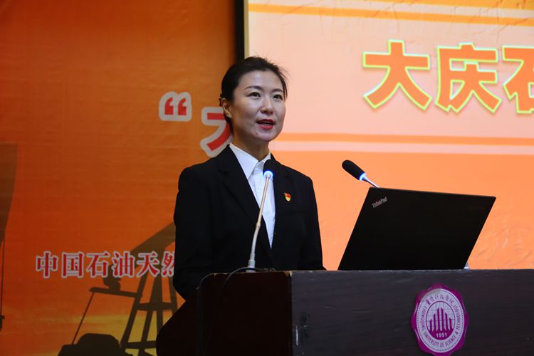 宣讲会由集团公司“石油魂——大庆精神铁人精神”宣讲总队首席宣讲员、铁人王进喜纪念馆综合办公室主任何德全和铁人王进喜纪念馆首席双语讲解员李娜两位同志作宣讲报告。两位宣讲员用大量珍贵的历史图片资料、音视频资料,饱含深情地讲述了那段艰苦卓绝、波澜壮阔的石油大会战历史,再现了那段令人难忘的峥嵘岁月,以不同的角度和维度为我们再一次解读了大庆精神铁人精神,让我们更进一步加深了对大庆精神铁人精神的理解和认知。“为国分忧、为民族争气”、“三老四严”这些耳熟能详的口号重新响彻耳边,“宁肯少活20年,拼命也要拿下大油田”的故事让我们的思想和灵魂再一次受到崇高的洗礼。整个宣讲报告过程中,会场座无虚席、连过道后排也坐满了学生,全场师生认真聆听者来自宣讲总队成员的宣讲报告,并不时地用笔记录着宣讲内容。当两位宣讲同志讲到:“进入新时代,站在新起点,大庆油田牢记习近平总书记的殷切嘱托,不忘初心、牢记使命,大力弘扬大庆精神、铁人精神,不断改革创新,推动高质量发展,肩负起当好标杆旗帜、建设百年油田的重大责任。为实现‘两个一百年’奋斗目标、实现中华民族伟大复兴的中国梦作出新的更大的贡献。让石油优良传统代代相传!让大庆精神铁人精神永放光芒!”时,雷鸣般的掌声响彻全场!宣讲结束后,学生代表向宣讲成员敬献了鲜花!